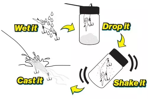 - Simply wet your lure, drop it in, shake, then cast